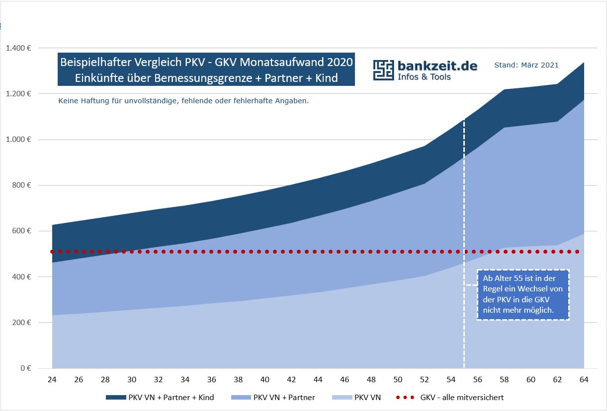Die gepunktete Linie stellt den Familienbeitrag in der GKV dar.
