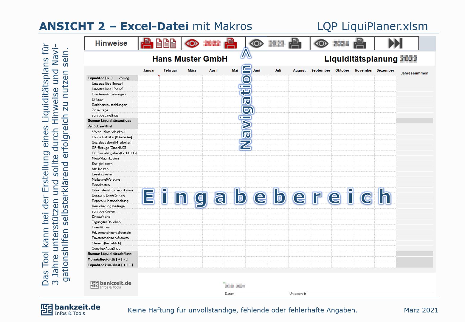 Voreinzustellen sind das Startjahr, der (Firmen-)Name und optional im ersten Monat ein bestehender Guthaben- oder Schuldsaldo. Danach werden die geplanten Eingänge (Umsätze, Erträge …) und Ausgänge (Ausgaben, Kosten …) monatlich in vollen EURO eingetragen. Hierbei ist zu beachten, dass die Ausgänge auch mit dem Minuszeichen voran eingegeben werden – sie erscheinen dann mit „-“ und in Rot.