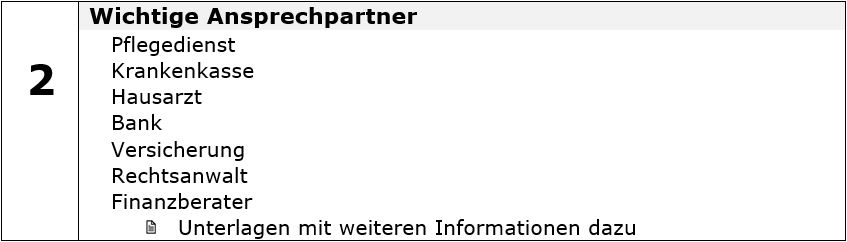 Es kann sehr sinnvoll sein, wichtige Unterlagen (z. B. auch eine Liste mit (Online-)Konten nebst Zugangscodes) auf einem - natürlich passwortgeschützen - Datenträger (z.B. USB-Stick) zu speichern und vorne in den Notfallordner zu heften oder zu kleben. Natürlich auch hier nicht vergessen, das Passwort an die Vertrauensperson(en) zu geben. Wichtig auch, den Ordner nebst Datenträger und seinen Inhalt regelmäßig und bei Bedarf zu aktualisieren.